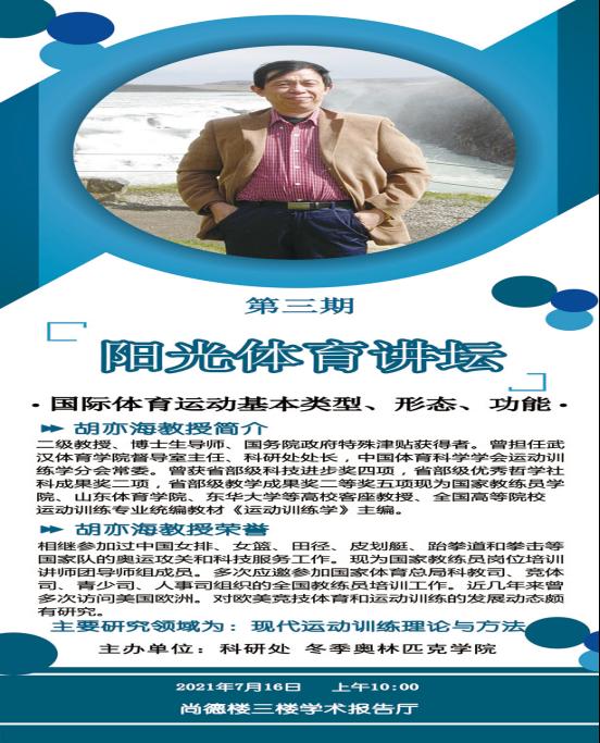 7月16日上午10:00时,阳光体育讲坛活动在尚德楼3楼学术报告厅顺利进行。本期讲坛由科研处和冬季奥林匹克学院联合主办,邀请了国内运动训练学知名专家胡亦海教授作了题为《国际体育运动基本类型、形态、功能》专题讲座。讲座由科研处副处长孙大海老师主持,研究生导师、青年教师、以及2020级研究生共计150余人聆听了此次讲座。