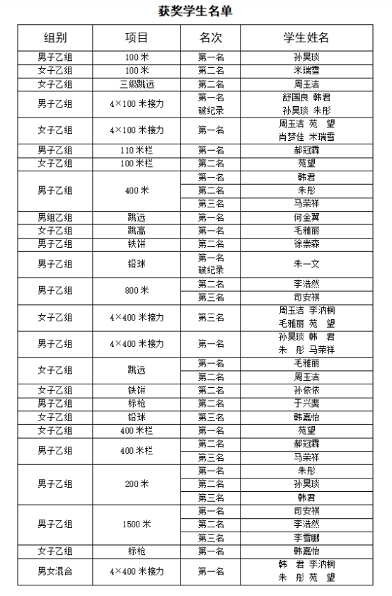 7月25日,校田径队在领队董欣、教练员赵益墨和拱梅宝的带领下,经过四个比赛日的激烈比拼,最终以15金12银7铜;男子团体总分第一名;女子团体总分第二名;男女团体总分第一名的优异成绩,创我校田径项目参加省学运会的历史最好成绩。