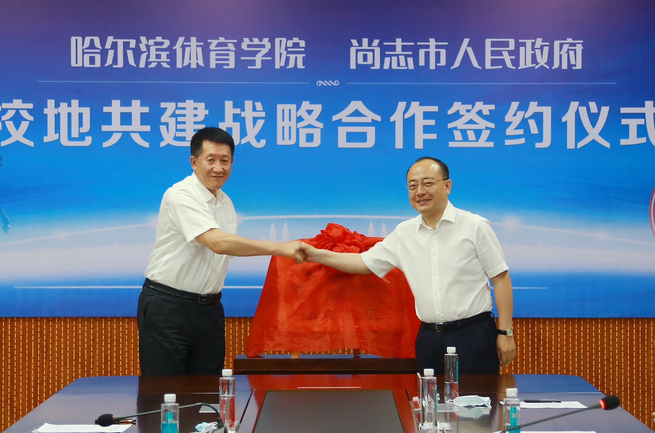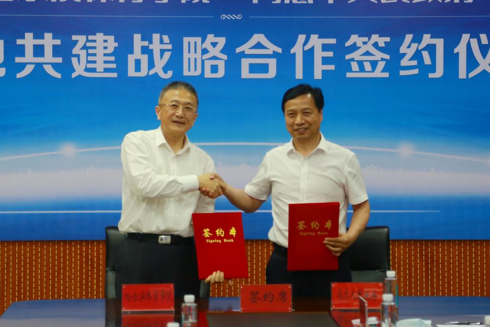 6月17日下午,哈尔滨体育学院与尚志市政府在尚志市委党校举行校地共建战略合作签约仪式。党委书记兰景力,党委副书记、校长陈德明,党委副书记姜玉洪,尚志市委书记刘海涛,市委副书记、市长张超,市委常委、常务副市长马启民出席签约仪式。尚志市委副书记迟金涛主持签约仪式。