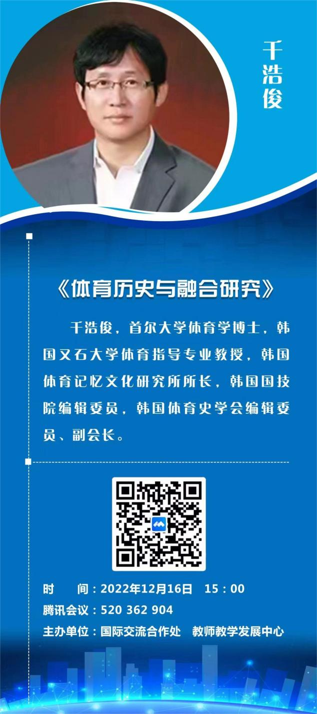 2022年12月16日下午15时,国际交流合作处联合教师教学发展中心邀请韩国又石大学千浩俊教授为我校师生进行线上讲座。讲座主题为《体育历史与融合研究》。本次讲座由国际交流合作处副处长胡萍教授主持,我校教师,博士、硕士研究生近300人参加了本次讲座。