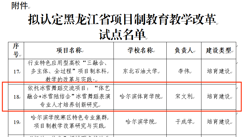 近日,黑龙江省教育厅公示了高校项目制教育教学改革试点拟认定名单。我校宋文利教师申报的《依托冰雪舞蹈交流项目:“体艺融合+冰雪陆结合”冰雪舞蹈表演专业人才培养创新研究》成功入选,被认定为培育建设试点。