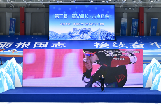 第三幕“薪火相传 未来已来”,由我校教师赵冠霖主讲,以“未来的征程——冰雪新生代”为主题,聚焦高亭宇、宁忠岩、廉子文等龙江籍新生代运动员在亚冬会背景下的集体突破,展现了中国冰雪运动体系化崛起的新图景。我校体育艺术学院和冬季奥林匹克学院师生表演了精彩纷呈的冰上舞蹈《超越梦想》,以艺术化的冰雪语言生动诠释了新时代青年的责任担当。