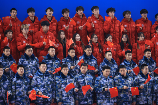 活动在庄严的升国旗仪式中走向高潮,由我校担任过亚冬会旗手的同学组成护旗方队,高擎国旗入场,全场师生肃立,目光追随着缓缓升起的五星红旗,气氛庄重而激昂。随后,国际奥委会委员、冬奥冠军张虹带领全场师生郑重宣誓:“以青春热血筑牢梦想,用实干担当报效祖国”,同学们的铮铮誓言响彻全场。紧接着,千余名师生共同唱响《歌唱祖国》。歌声磅礴而深情,既传递出对祖国的无限热爱,也昭示着新时代龙江青年砥砺前行、续写荣光的坚定决心。至此,这堂沉浸式冰雪思政课在激昂的爱国共鸣中圆满落幕,余韵悠长,振奋人心。