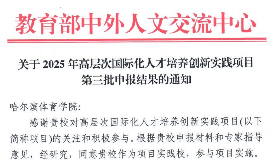 近日,教育部中外人文交流中心公布2025年高层次国际化人才培养创新实践项目第三批建设高校名单,哈尔滨体育学院(国家冰雪运动学院)成功获批入选,标志着我校在国际化人才培养平台建设方面取得重要突破。