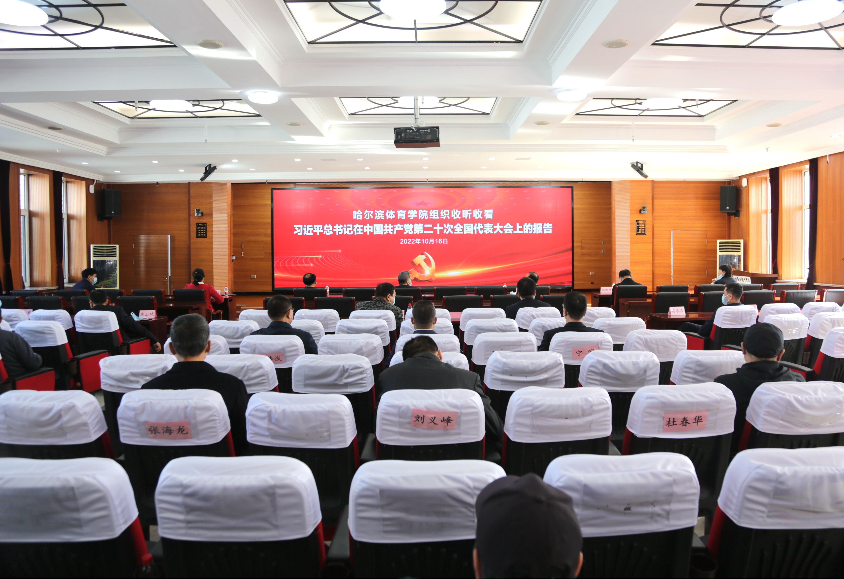 校领导、党政机关、教学教辅部门主要负责人、各党总支、直属党支部书记、黑龙江省滑雪运动学校校长在尚德楼三楼学术报告厅主会场集中收听收看了党的二十大开幕会。各党总支、直属党支部均在本总支、支部组织党员干部、学生党员集中收听收看,校团委组织团员青年代表在大学生活动中心、学生食堂、六公寓会议室集中收听收看,求智楼屏幕同步直播大会实况,供其他在校党员干部师生员工收听收看,实现收听收看全覆盖。