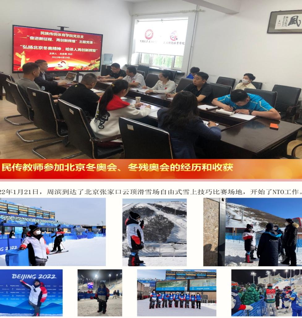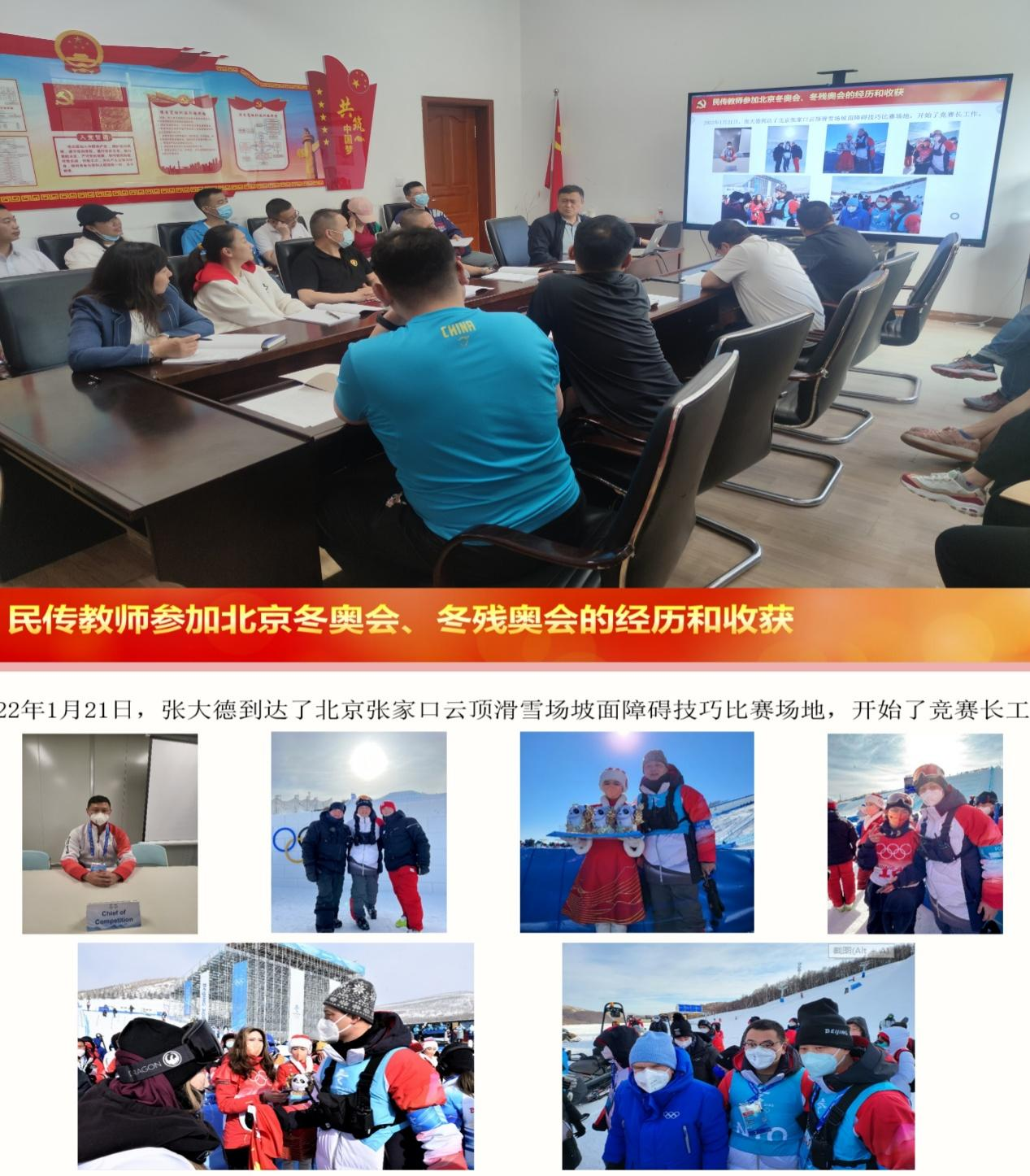 2022年1月,民传学院四位教师受北京冬奥组委邀请服务助力北京冬奥会、冬残奥会,张大德担任单板和自由式坡面障碍技巧项目竞赛长,吕吉勇、周滨和宋宇虹担任NTO技术官员。四名同志在各自的岗位上较好的完成了工作任务,受到了北京奥组委的表扬。