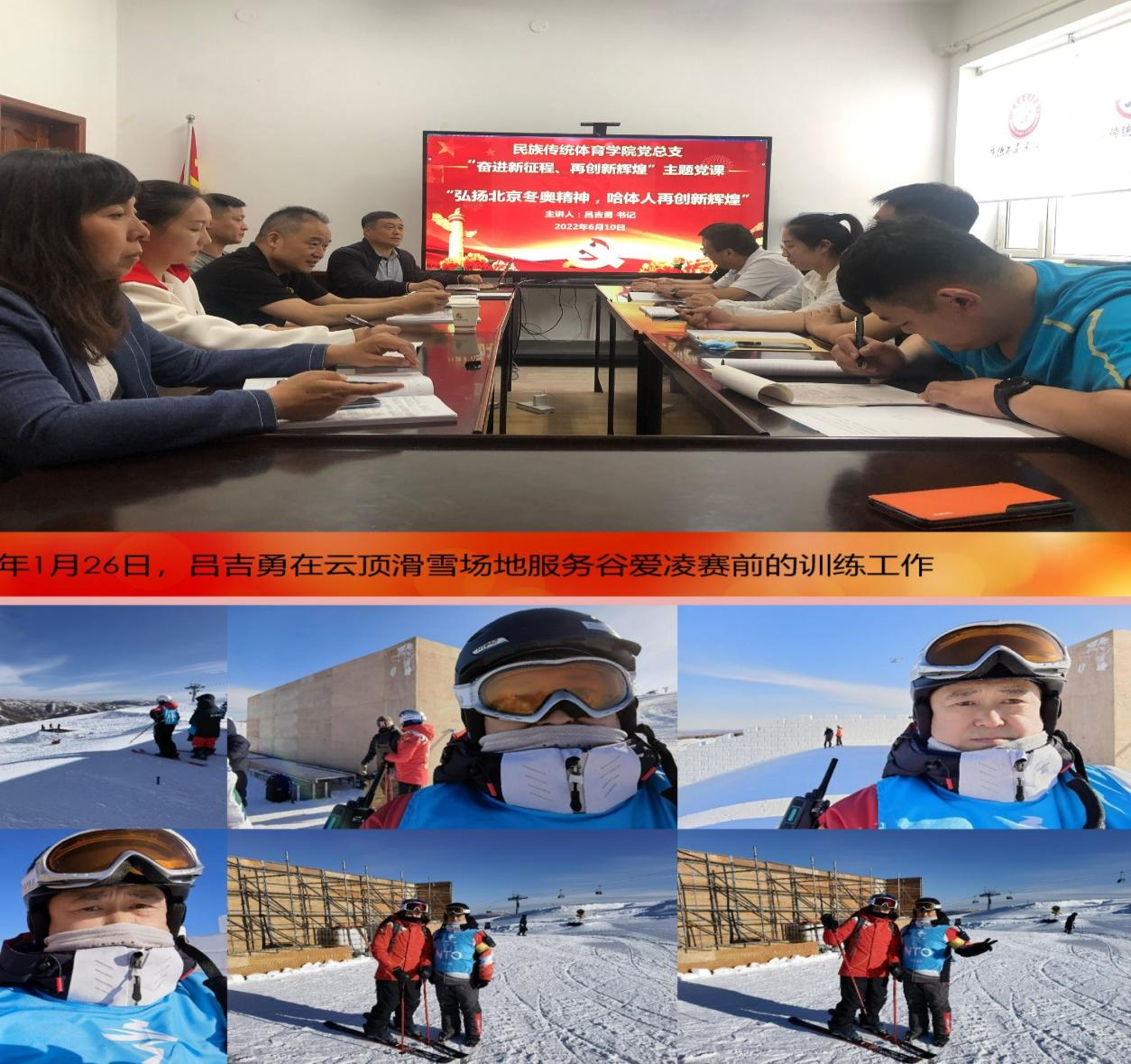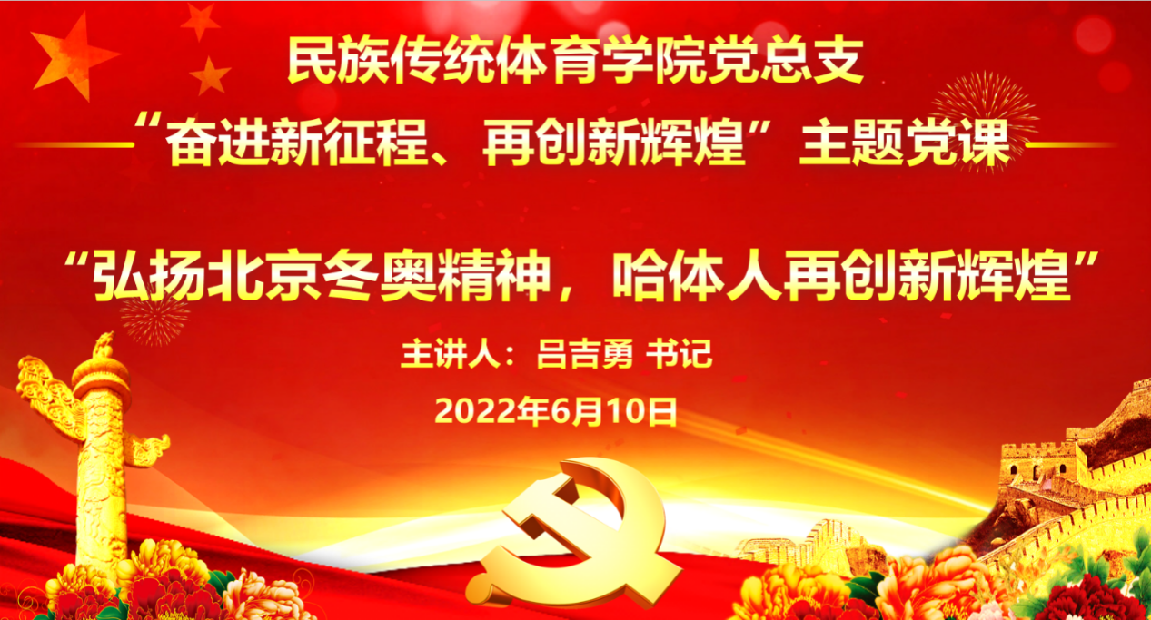 6月10日下午,民族传统体育学院党总支召开了“奋进新征程、再创新辉煌”省第十三次党代会主题党课,题目是“弘扬北京冬奥精神,哈体人再创新辉煌”。本次主题党课主讲人党总支书记吕吉勇将省第十三次党代会精神与北京冬奥精神相结合,与服务助力2022年北京冬奥会、冬残奥会经历相结合,从三个方面进行了讲授:一是民族传统体育学院教师参加北京冬奥会、冬残奥会的经历和收获;二是北京2022冬奥会申办理念和中国冬奥精神;三是弘扬北京冬奥精神,哈体人再创新辉煌。教工党支部书记周滨和学生党支部书记张大德进行了冬奥经历分享。学院全体教师在院会议室现场聆听,全体学生党员线上参会。