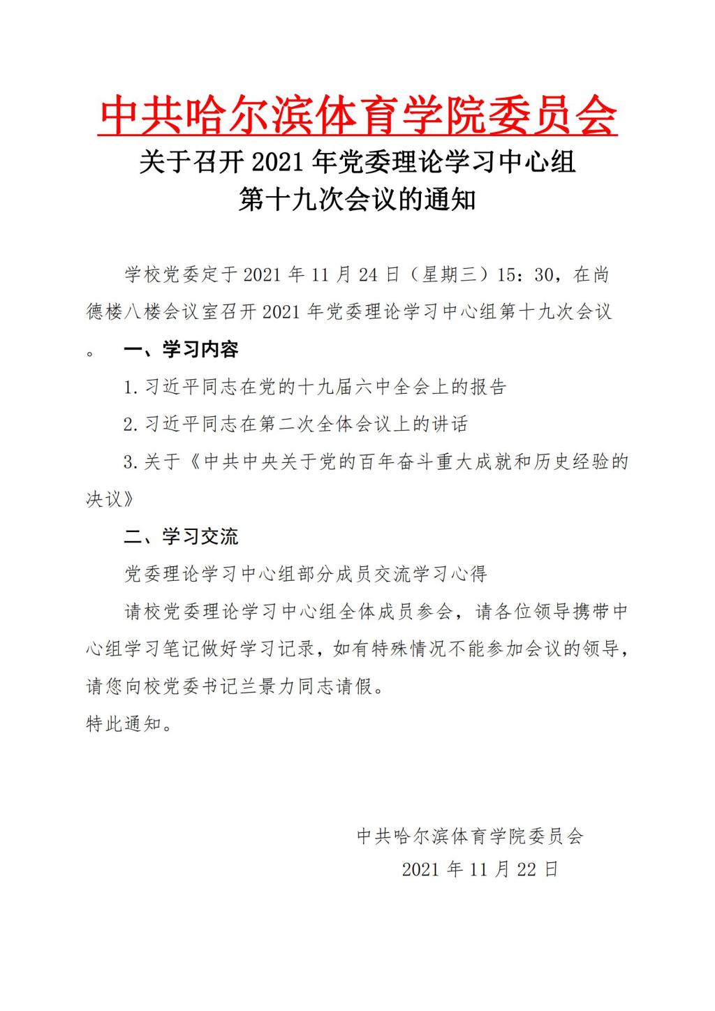 关于召开2021年党委理论学习中心组第十九次会议的通知