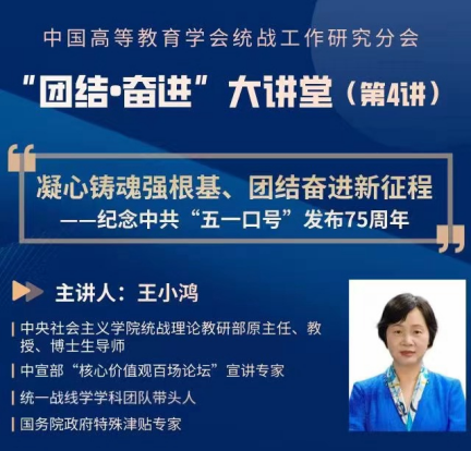 为贯彻落实习近平总书记关于做好新时代党的统一战线工作的重要思想,纪念“五一口号”发布75周年,进一步推动学校党外知识分子思想政治引领,5月30日,校党委宣传统战部组织分享了线上中国高等教育学会统战工作研究分会举办“团结·奋进”大讲堂(第4讲),中央社会主义学院统战理论教研部原主任、教授、博士生导师王小鸿作了题为“凝心铸魂强根基、团结奋进新征程——纪念中共‘五一口号’发布75周年”的专题辅导报告,学校党外知识分子代表在尚德楼九楼会议室参加了集中学习。
