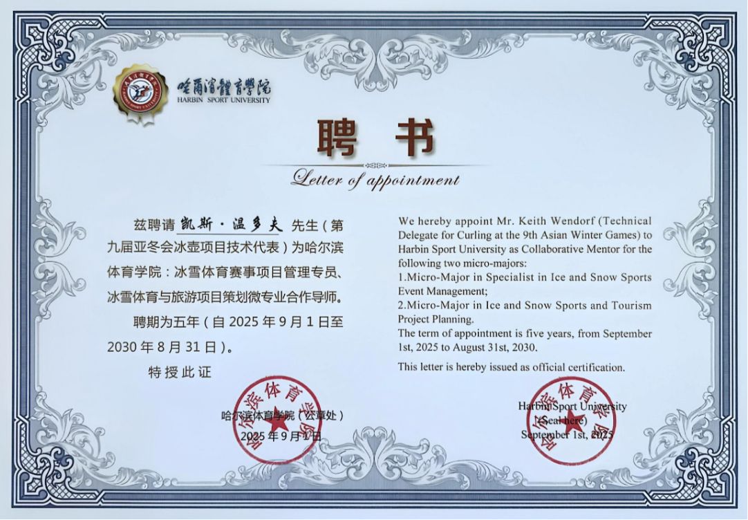 凯斯·温多夫先生是国际冰雪赛事领域的资深专家,曾先后担任2014年索契冬奥会、2018年平昌冬奥会及2025年哈尔滨亚冬会冰壶项目技术代表,深度参与大型赛事全流程筹备与运行,在赛事组织管理、技术规范与执行等方面具备卓越的专业能力。对于此次合作,凯斯·温多夫先生表示,感谢学校的认可与盛赞,他同样期待双方的合作,认为这将是一段令人振奋且富有收获的经历。