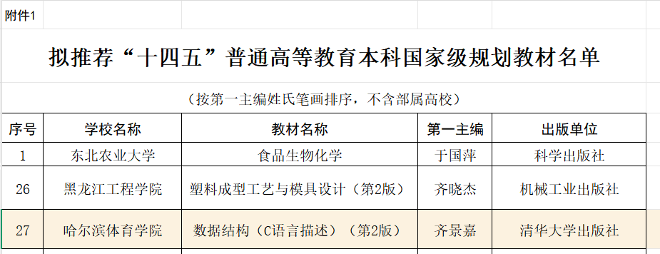 近日,黑龙江省教育厅对拟推荐“十四五”普通高等教育本科国家级规划教材及拟认定第二批省级规划教材(培育项目)的名单予以公示。我校齐景嘉教授的《数据结构(C语言描述)》《数据结构习题与实训教材(C语言描述)微课视频版》和刘义峰教授的《中小学体育教材教法》等3部教材成功入选,其中《数据结构(C语言描述)》被推荐评选国家级规划教材,这标志着我校在教材编写与教学改革领域取得了新的重要突破。