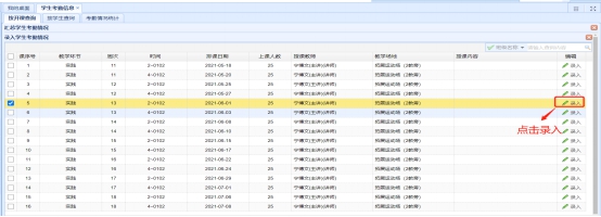 “录入”功能,系统会弹出这门课程开课周次、上课时间,按照实际上课选定周次和节次,点击右边的录入,比如下图图4,录入第13周周二0102节考勤情况,点击右边对应的“录入”。