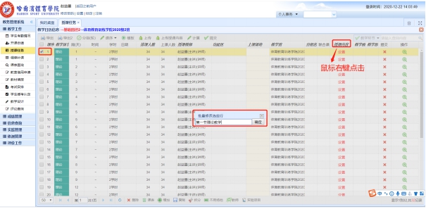 每一节次可以填写授课内容,操作方法是选定某一条记录,右键点击上方的“授课内容”,弹出的对话框内输入上课内容,然后点击确定即可。如下图: