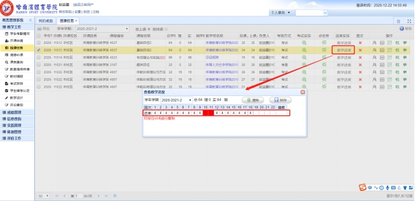 2、选择任一门课程点击“教学进度”填写教学进度(每周几学时),填写完毕之后点击保存按钮,如下图所示:
